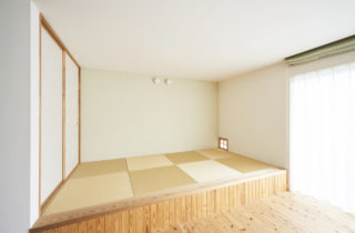 中心にあるテーブルをきれいに囲むように畳を敷きました。畳の種類は、カラー畳 MIGUSA (SEKISUI)「目積-モカベージュ」を使用し、落ち着いた雰囲気のお部屋になるよう仕上げました。
